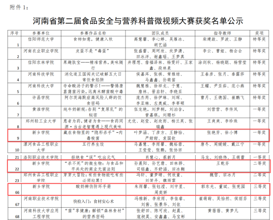 11月23日,由河南省教育厅主办的第二届河南省大学生食品安全与营养科普微视频大赛决赛在许昌学院圆满结束。本届赛事面向全省高校征集优质科普作品,共有28所高校的51部作品进入决赛,影响范围广、参与度高,在推动食品安全知识传播、倡导健康饮食理念、提升公众科学素养等方面具有重要社会意义。