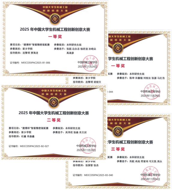 近日,在2025年中国大学生机械工程创新创意大赛智能精密装配赛全国总决赛中,我校机电工程学院学子喜获佳绩,斩获全国一等奖2项、二等奖1项、三等奖1项。