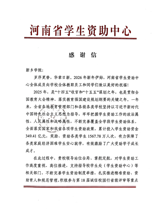 近日,我校收到河南省学生资助中心寄来的感谢信。信中,省资助中心对我校在过去一段时间里对学生资助工作的高度重视与扎实推进表示充分肯定,并对学校在相关工作中的鼎力支持致以诚挚谢意。