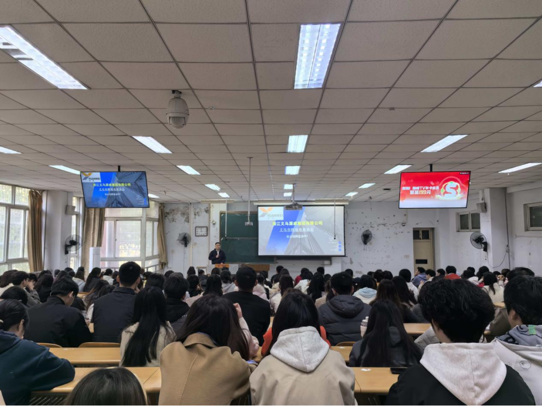 宣讲会上,王景涛结合自身创业历程,深入浅出地剖析了全球跨境电商的发展趋势与机遇。他介绍,自2015年成立以来,义乌源威依托义乌“世界小商品之都”的供应链优势,已发展成为一家业务覆盖亚马逊、速卖通、抖音、淘宝等多平台的综合性电商企业。王景涛强调,“在数字经济的浪潮中,实战是人才成长最快的路径”,并表达了公司与高校紧密合作、共同培养新时代电商人才的强烈愿望。