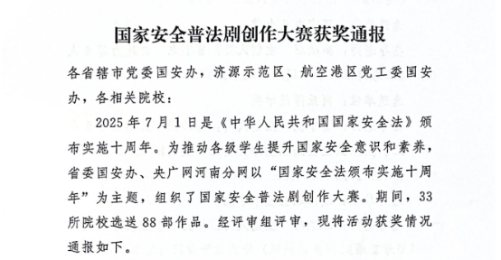 近日,由省委国安办、央视网河南分网联合主办的国家安全普法剧创作大赛获奖结果揭晓,药学院学子李雅、张文芳、张一凡组成的参赛团队凭借扎实的国家安全素养和突出的创新创意能力,脱颖而出,其参赛作品《风景照里的“秘密”》荣获创作三等奖,为学校赢得了荣誉。