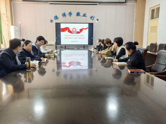 为深入贯彻落实党中央和省委关于开展树立和践行正确政绩观学习教育的部署要求,引导全院党员、干部牢记为党育人、为国育才初心使命。3月31日,经济学院党委在A01-503会议室举办树立和践行正确政绩观学习教育读书班。经济学院党委书记陈卓,院长韩楠,副院长郭玉杰、刘晔及全体科级干部参加学习。