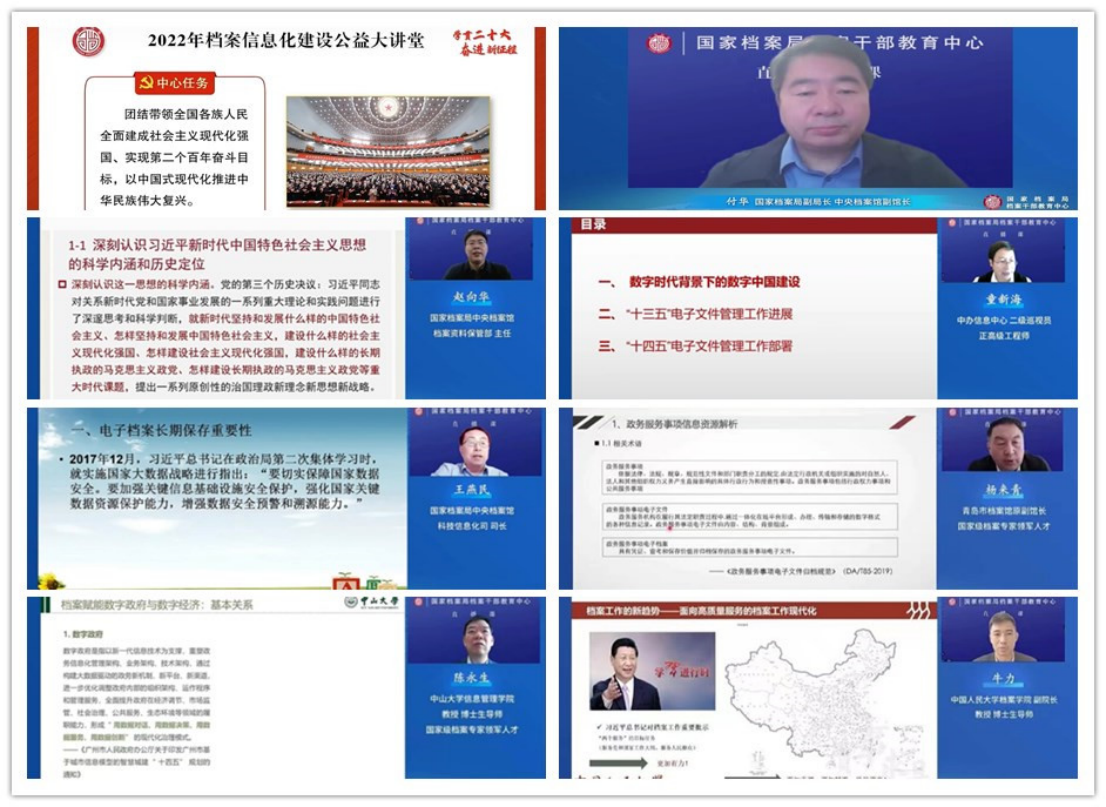 为深入学习贯彻党的二十大精神,深刻领悟习近平总书记对档案工作的重要批示精神,推进档案工作与国家治理体系和治理能力现代化,12月20日至22日,档案馆组织全体人员在线收看了由国家档案局档案干部教育中心举办的,以“数字中国数字政府背景下的档案工作”为主题的2022年档案信息化建设公益大讲堂系列讲座。