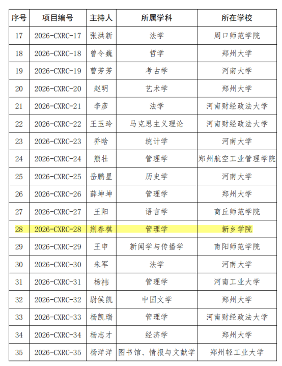近日,中共河南省委教育工作委员会、河南省教育厅联合发布了《关于公布2026年度河南省高等学校哲学社会科学创新人才支持计划立项名单的通知》(豫教工委〔2025〕119号),正式公布了2026年度立项资助名单。经学校推荐、专家评审、现场答辩、网上公示等程序,全省高校共有43位优秀学者获得立项资助。其中,我校管理学院荆春棋博士成功入选,是我校近年来在该人才计划上的首次立项突破,体现了我校在哲学社会科学领域持续深化学术积累、强化人才引育的显著成效。