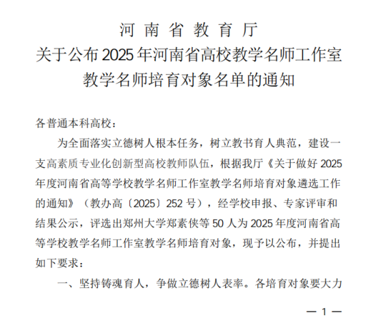 河南省高校教学名师工作室教学名师培育项目,是省教育厅深入落实立德树人根本任务、选树教书育人先进典型、建设高素质专业化创新型高校教师队伍的重要举措,对引领全省高校教师教学发展具有重要意义。
