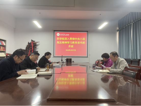 3月27日-28日,根据《方案》要求,药学院举办了深入贯彻中央八项规定精神学习教育读书班,读书班采取了书记领学、集中自学、集中交流研讨等形式开展。读书班期间,学院党委书记骆云飞领学了《十八届中央政治局关于改进工作作风、密切联系群众的八项规定》《中共中央政治局贯彻落实中央八项规定实施细则》等内容;药学院党委理论学习中心组集中学习了《习近平关于加强党的作风建设论述摘编》《习近平关于党的建设的重要思想概论》等学习资料;在集中交流研讨环节,党委理论学习中心组成员联系思想和工作实际依次作了交流发言,谈认识体会和下一步打算。