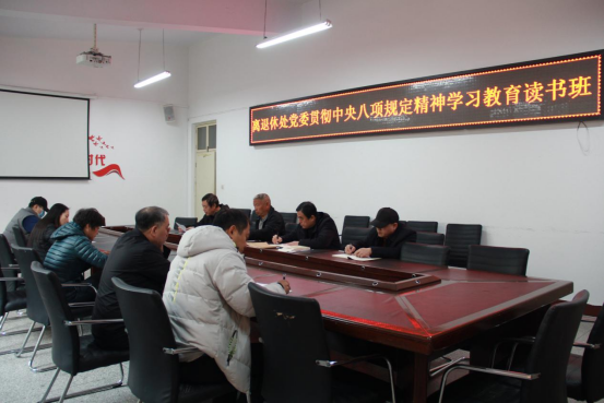 根据学校党委安排,为深入贯彻中央八项规定精神学习教育,推进作风建设走深走实,3月31日—4月1日,离退休处党委在大学生活动中心二楼会议室组织深入贯彻中央八项规定精神学习教育读书班,离退休处全体党员参加学习,会议由离退休处党委书记丁西省主持。