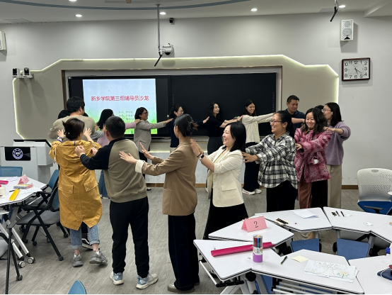 活动分三阶段开展。第一阶段通过破冰游戏、团队组建、团员互动、协作挑战等环节,打破人际关系壁垒,让来自三个学院的老师之间的距离感拉近了。此活动为各位老师在指导学生开展工作提供一些借鉴和参考。第二阶段聚焦心理危机干预,围绕危机定义、干预对象识别及应对策略展开研讨,利用SMART目标设立原则和焦点技术等,结合家庭、学校与求助者三方协作对求助者进行干预,以此达到帮助求助者的目的。第三阶段特邀嘉宾郭晓薇通过心理辅导案例引导与会者通过互动研讨和经验分享,探讨工作中遇到的问题及解决方案。