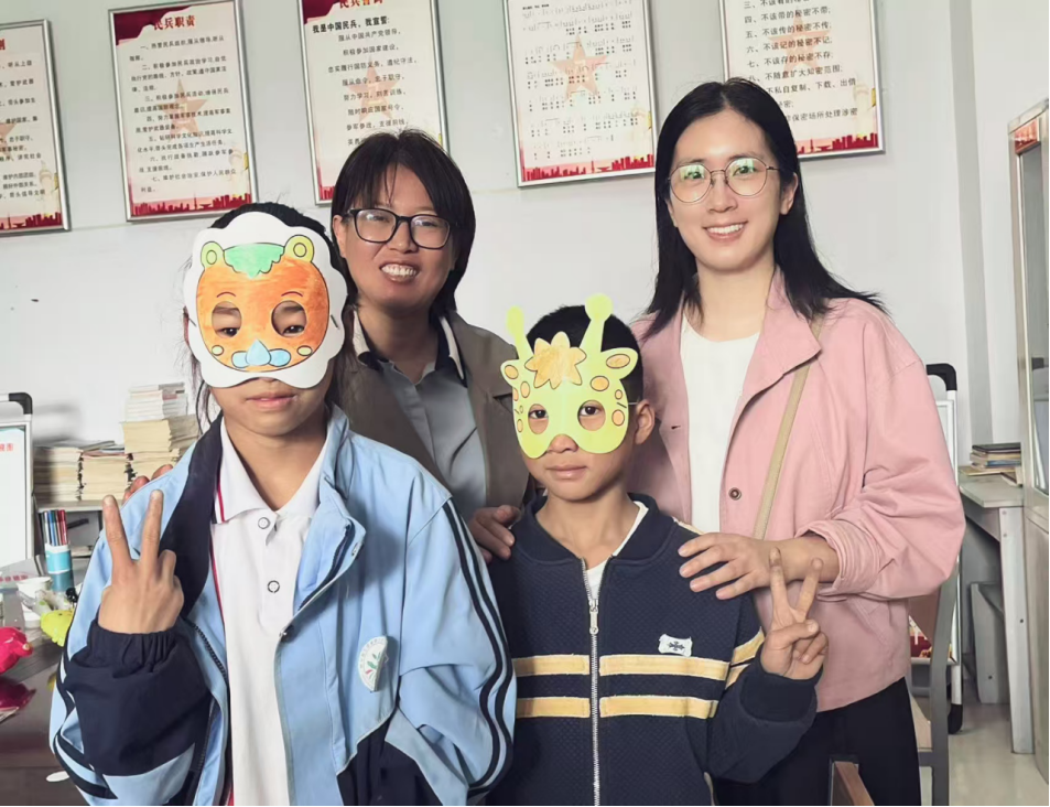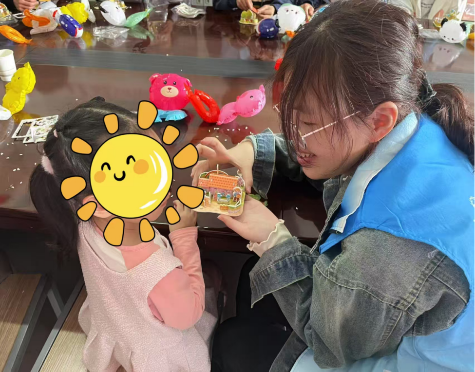 在手工制作环节,志愿者一对一指导孩子们进行立体拼图。一块块拼图在小手中逐渐变成了一座座各式各样的立体房子。看着自己亲手完成的作品,孩子们的脸上洋溢着自豪和喜悦的笑容。这些小小的房子,不仅是孩子们动手能力的见证,更是他们心中梦想家园的雏形。“彩虹刮刮画”活动则为孩子们打开了一扇五彩斑斓的艺术之门。孩子们用刮笔在黑色的画纸上轻轻刮擦,一幅幅五彩缤纷的世界逐渐显现。最后,志愿者们协助孩子们用水彩笔绘制动物面具。孩子们发挥着自己的创意,用鲜艳的色彩勾勒出可爱的动物形象,戴上面具后,仿佛变成了一个个活泼的小精灵。