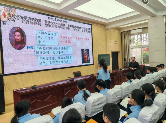 4月9日上午,专家组来到新蔡县今是中学进行跟踪指导,观摩袁春霞老师《孙权劝学》的公开课。省培专家周枫琳老师肯定了教师创设情境和运用信息教师手段赋能课堂教学的作用。针对本次教学,周老师指出可以基于人物出身背景和故事发生背景进行优化设计,可根据吕蒙出生于汝南郡,今天大概就是新蔡中学的周边这一真实情境进行教学设计,既有利于学生理解,也有利于课程思政开展;吕蒙出身背景的前期理解,也会驱动学生充分理解古文中人物对话的真正本质。省培专家崔丽老师指出:课堂教师提问过于碎片化,可以提出一个主问题,然后分设几个小问题的方式对整体教学进行结构化、逐层深入的教学设计。听评课后专家团队还与今是中学教师围绕新课标单元教学设计、教学梯度设置以及AI技术运用等议题展开了深入探讨。