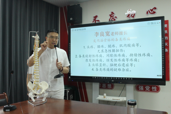 在关爱师生健康板块,中国“澄江针灸学派”第三代传人李良宽老师作为主讲嘉宾分享了精彩的中医诊疗知识。他主要讲述了教师职业病的诱因和预防机理,特别是常见的颈肩腰椎疼痛的预防和治疗,专家团队针对教职工常见的健康问题,如长时间伏案工作导致的颈椎、腰椎疾病等提供了预防保健的知识以及针对性治疗。现场互动与实操诊疗环节引起了全体老师的浓厚兴趣,教职工们积极提问,与专家频繁互动,个别老师进行了现场体验,取得良好效果。