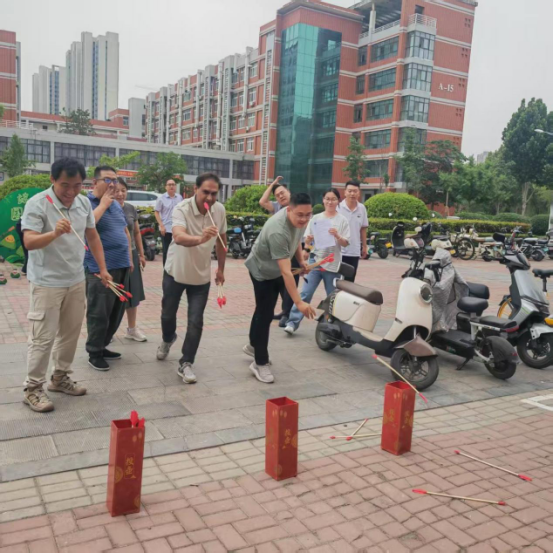 “趣玩端午”民俗体验游戏活动设有投壶、套粽子和射五毒等游戏,游戏环节气氛尤为热烈,高潮迭起,现场欢声笑语不断,教职工在游戏的欢声笑语中体验了传统技艺,游戏获胜者领取了精美礼品。