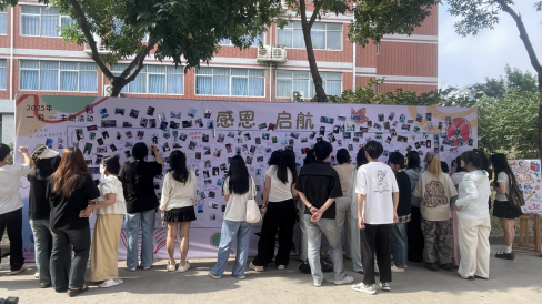 活动现场,一面融合专业特色的巨型照片寄语墙格外引人注目。这面墙由美术学院师生设计制作,将线上征集的优秀作品进行实体展示,并加入校园生活场景。观看展示墙时,学生们回忆起校园时光,感触颇多。大家在墙上写下对父母、老师、同学的感谢,以及对未来的规划,展现出积极的精神面貌。