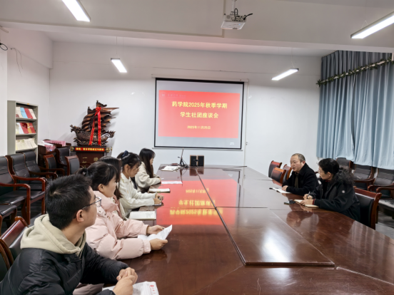 为提升学生社团的建设水平与育人实效,进一步激发学生社团的发展活力,11月26日下午,药学院于会议室召开2025年秋季学期学生社团座谈会。药学院党委书记骆云飞、副书记韩爱慧,分团委负责人曹倩和学院社团骨干参加了此次会议。