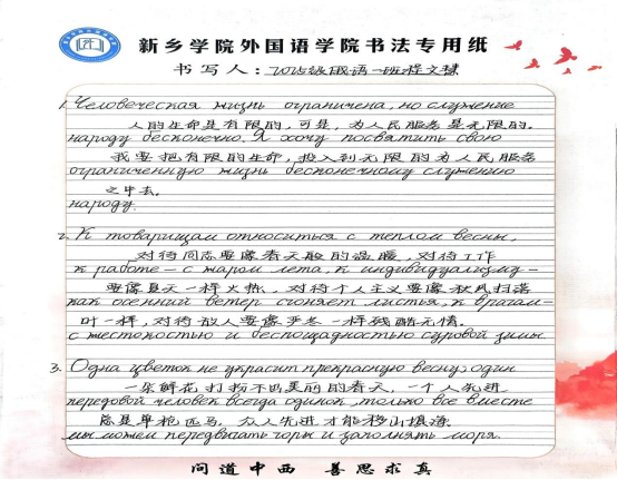 活动以雷锋精神金句摘抄为核心载体,将思想政治教育与专业实践深度结合,鼓励学生以双语形式书写雷锋经典名言。活动中,同学们静心品读雷锋同志的经典语录,一笔一画认真摘抄,一字一句深刻感悟,在沉浸式学习中领会“奉献、友爱、互助、进步”的志愿精神内涵,理解雷锋精神的时代价值。活动将雷锋精神学习融入日常、抓在经常,有效营造了“人人学雷锋、处处践初心”的浓厚校园氛围,让雷锋精神在跨语言表达中焕发新活力,展现了青年学子坚定的理想信念、勇担时代使命的精神风貌。