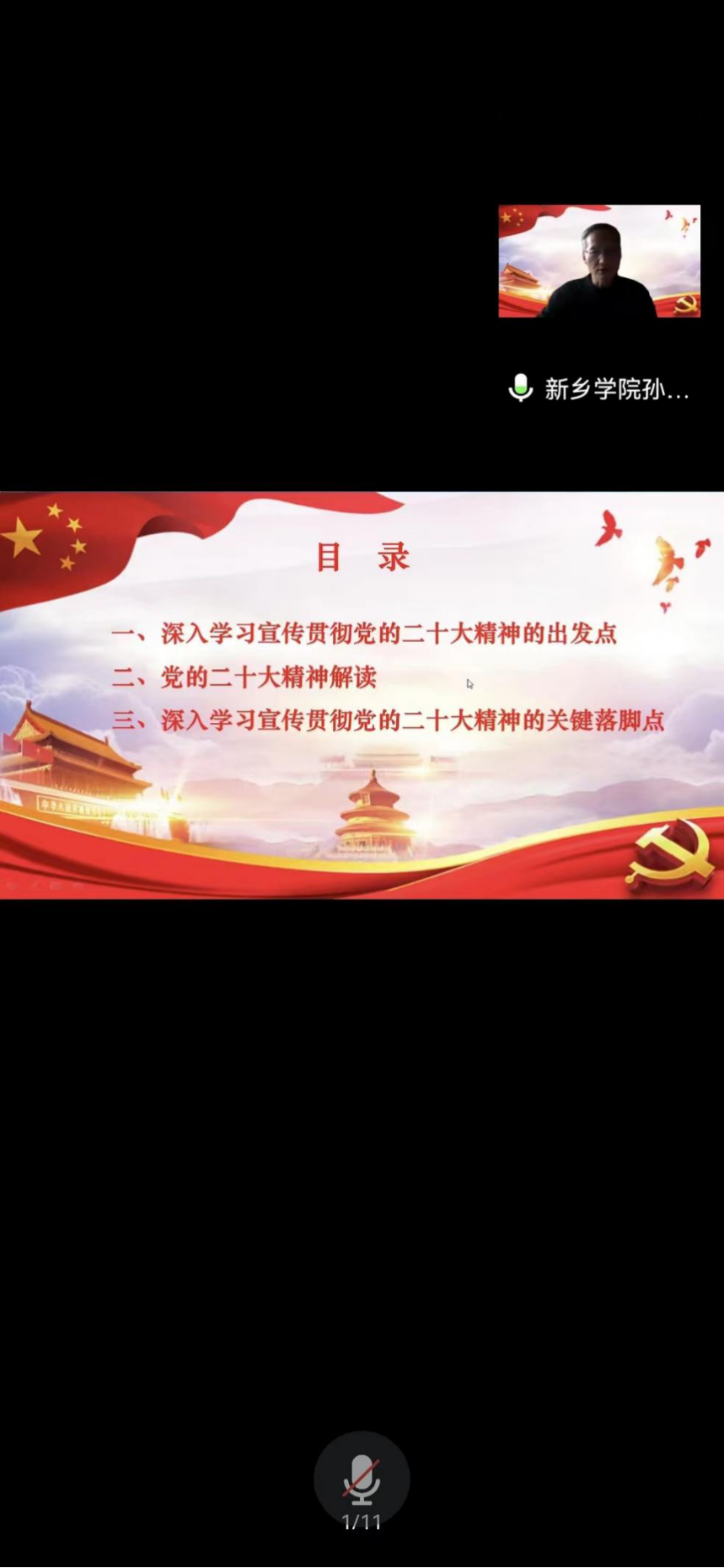 孙晓棠紧紧围绕党的二十大的主题和主要成果,从“深入学习宣传贯彻党的二十大精神的出发点、党的二十大精神解读、深入学习宣传贯彻党的二十大精神的关键落脚点”等三个方面对党的二十大精神进行了全面、深入、系统的解读。他在报告中首先指出深入学习宣传贯彻党的二十大精神要从十个“一”入手;其次分别从我党过去五年的工作和新时代十年的伟大变革,新时代以来的三件大事和十六个方面的成就;马克思主义中国化时代化新境界;新时代新征程中国共产党的使命任务;新发展格局、新发展理念和全面推进乡村振兴;增进民生福祉提高人民生活品质;全面从严治党等六个方面对党的二十大精神进行了解读;最后孙书记在报告中强调要领悟“两个确立”,统筹两个大局;要心怀“国之大者”,紧扣中心任务;要牢记“三个务必”,坚持人民至上;要勇于自我革命,引领社会革命;要坚定历史自信,增强历史主动。